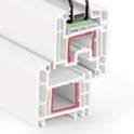 Largeur de profilé 70 mm, système à double joint de frappe Nombre de chambres : 5 Valeur d’isolation: Uf = 1,3W/m²K(avec renfort standard) Valeur d’isolation avec renfort à rupture thermique: Uf = 1,2W/m²K Isolation phonique: jusqu’à classe 5 (DIN V ENV 1627) Etanchéité à l’air et à l’eau : hauteur de 50 m (DIN 18055) Coin exempt d’eau de condensation |